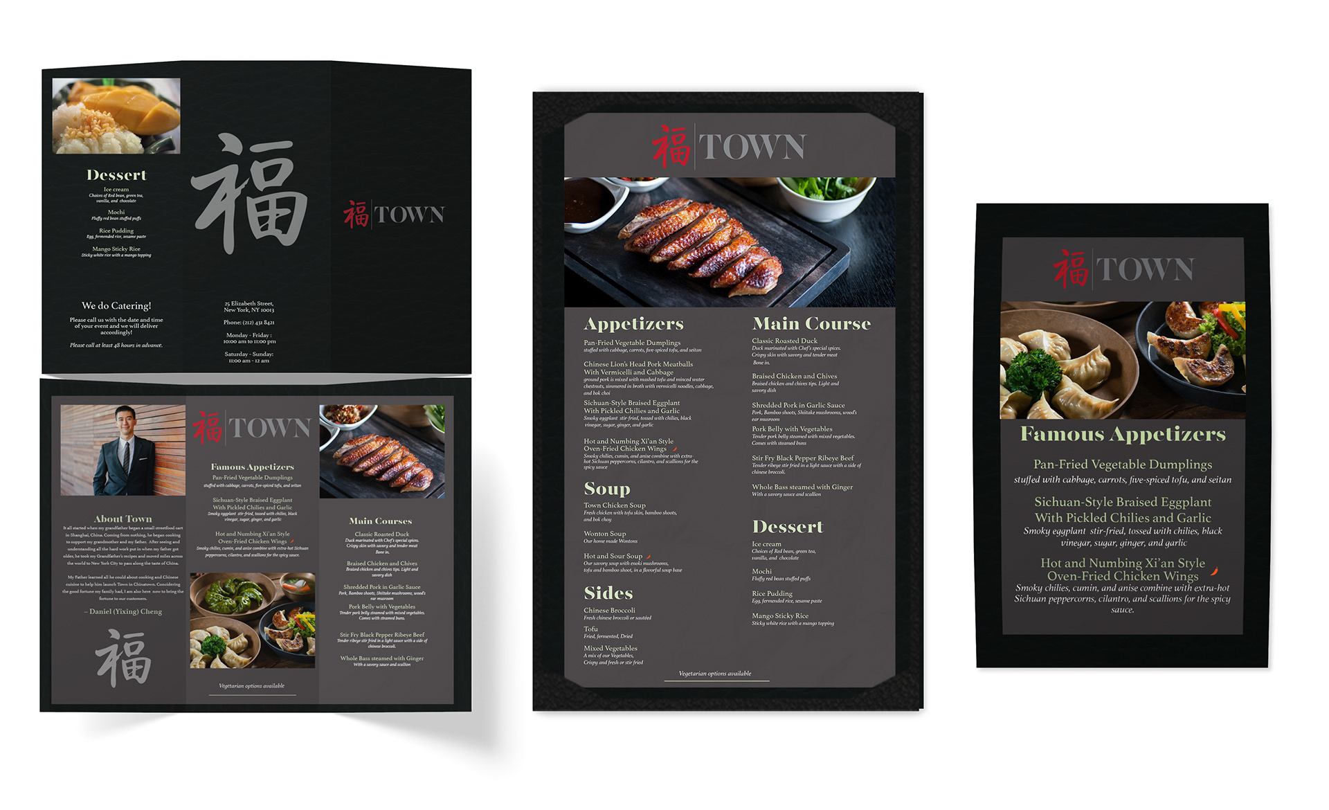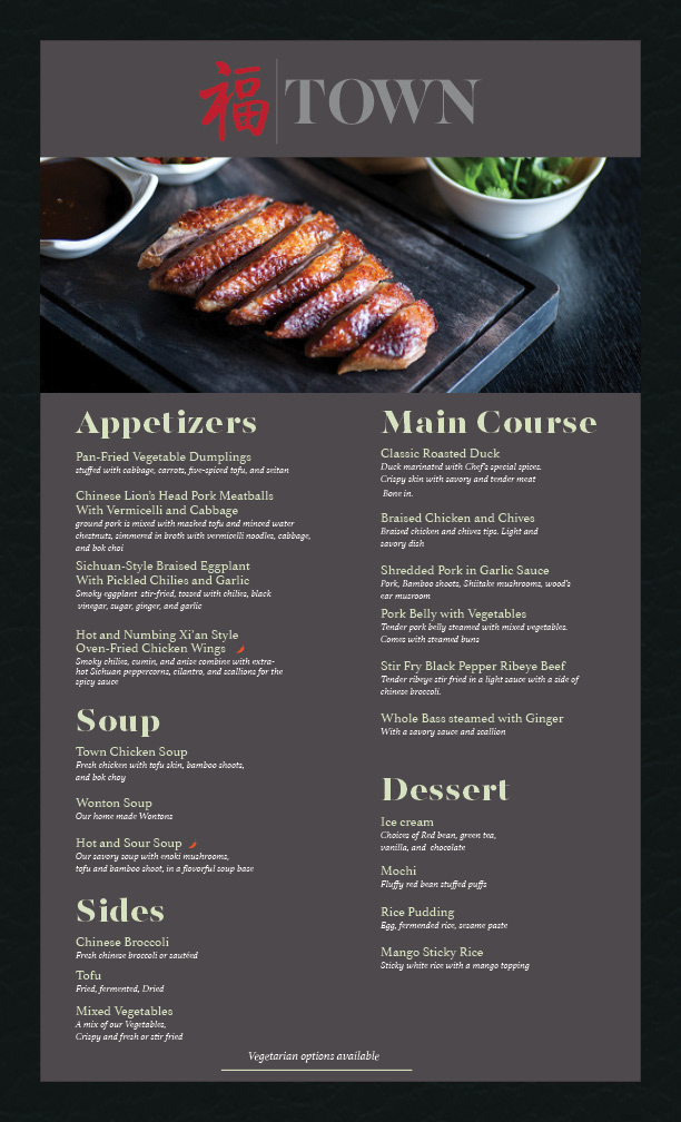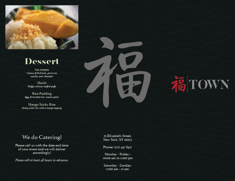 The project was rebranding a high end chinese restaurant using their existing logo, color palette, and font choices. I decided to go with a darker color from their palette to help give it a more sleek and refined look. I also went with a single page menu as this is a trend among high end restaurants.
